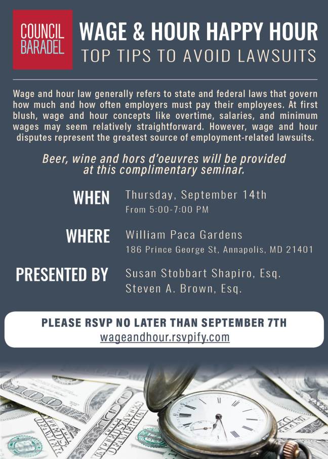 Susan Stobbart Shapiro and Steven A. Brown will be hosting a “Wage & Hour Happy Hour” to discuss top tips for businesses to avoid employment-related lawsuits. The complimentary seminar will be held at the William Paca Gardens on September 14th from 5-7pm and will feature beer, wine and hors d’oeuvres. To register for the seminar, click here.
